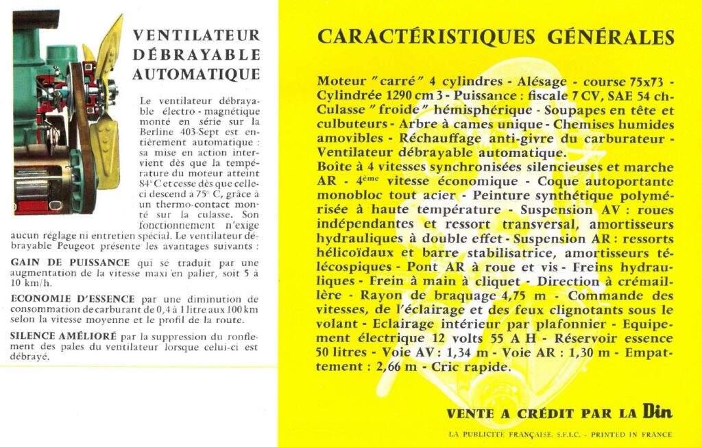 De 403 Sept is uitgerust met een handgeschakelde vierversnellingsbak met gesynchroniseerde versnellingen, inclusief een “economische” vierde versnelling. De auto beschikt over een robuuste zelfdragende stalen carrosserie en is voorzien van synthetische polymeer-verf, bestand tegen hoge temperaturen.
